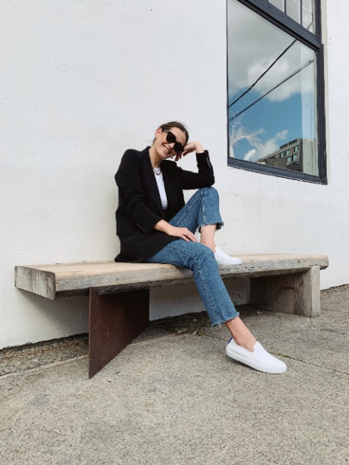 外搭纯黑色修身西装,内搭简单白T外加牛仔休闲裤,ROTHY’S经典小白鞋,舒适易穿,扮出随性风格。无论逛街或是度假,ROTHY’S经典小白鞋陪伴你乐享酷飒人生。