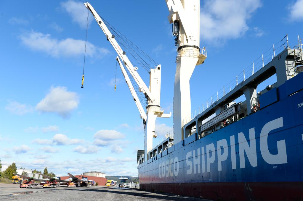2018年9月15日,中远海运“天恩”轮在瑞典东北部港口城市海讷桑德的码头上进行卸货作业。新华社记者 刘红霞 摄