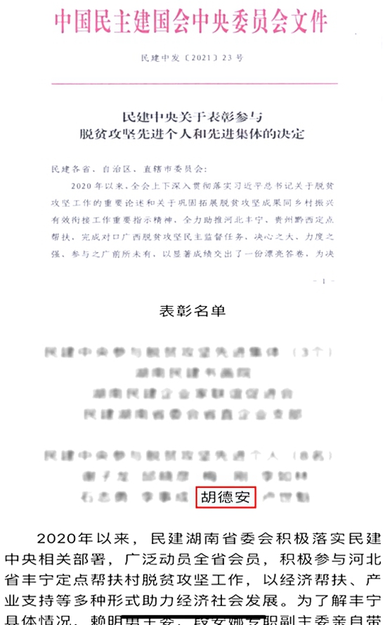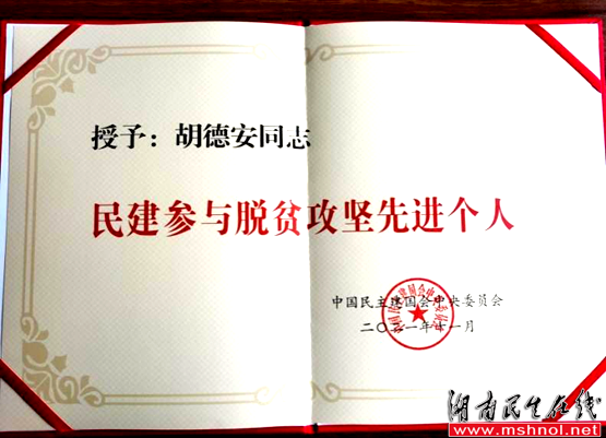 ▲ 2021年,胡德安被民建中央委员会授予“民建参与脱贫攻坚先进个人”荣誉称号