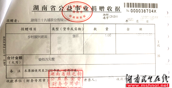 ▲2021年7月23 日三十九铺助力湖南省绿之韵公益基金会抗灾、修路捐款壹佰万元