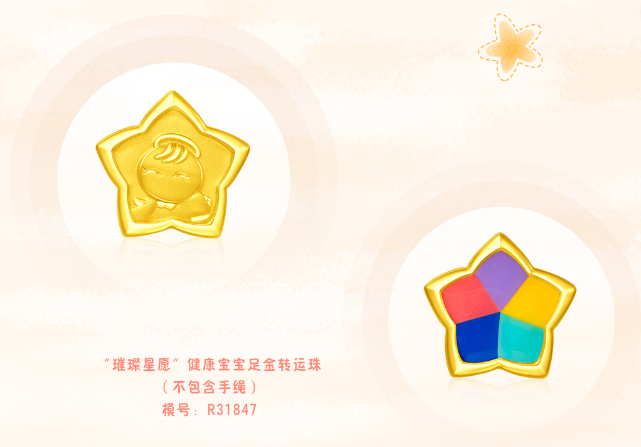 代表梦想的星星,承载着美好的祝愿。健康宝宝守护每个儿童的缤纷星愿。(“璀璨星愿”健康宝宝足金转运珠)