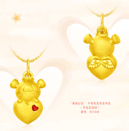 平安宝宝倚着爱心,将最圆满的爱带到身边,给儿童最美好的祝愿。(“爱由心生”平安宝宝足金吊坠)