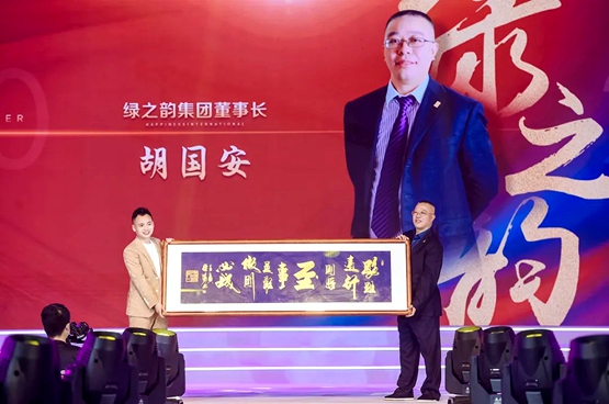 ▲绿之韵集团董事长胡国安向所有幸福代言人赠寄语牌匾