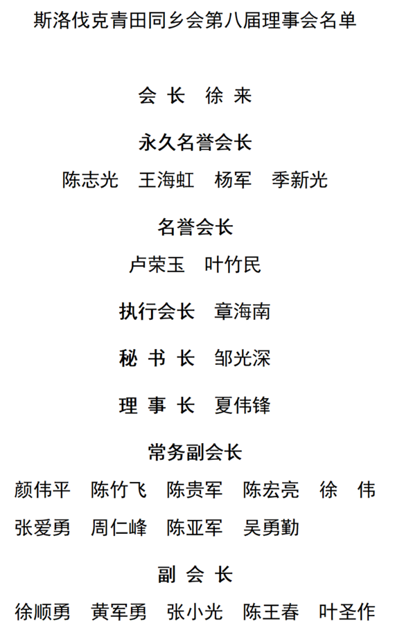 斯洛伐克青田同乡会理事长夏伟锋宣读第八届理事名单。