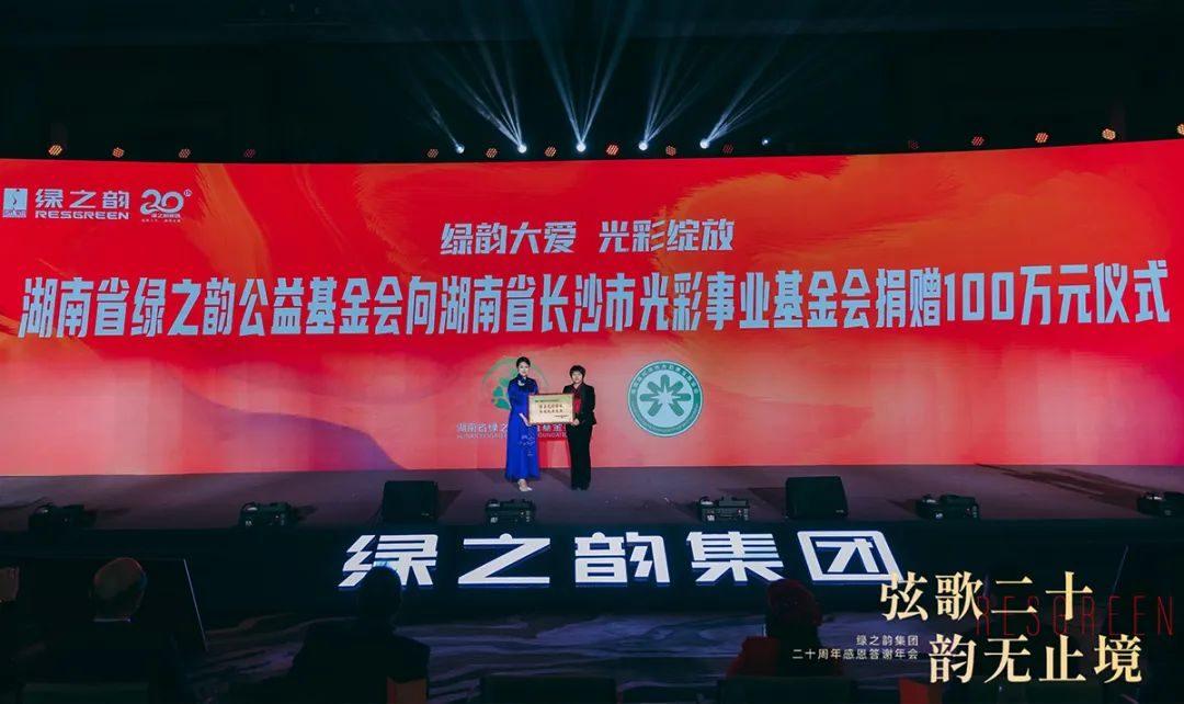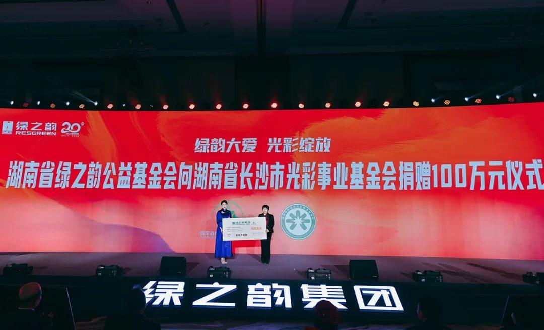 驭时而进,廿载逐光;回溯往昔,心怀感恩;继往开来,至臻致远。创立20年来,绿之韵积极承担企业公民责任,热心公益事业。公益路上,绿之韵的事业伙伴中也涌现出众多的向善向上的力量,瑞僖金融、绿之韵三十九铺、云来科技、绿之韵低碳、绿之韵碧波庭、绿之韵数字化健康科技、绿之韵幸福国际、绿之韵微看等凭借积极投身公益获得绿之韵“20年公益大使奖”。湖南省工商联(总商会)党组成员、副主席漆平波,中共长沙市委统战部副部长、市侨办主任杨光华上台为获得者颁奖。晚会现场,劳嘉理事长代表绿之韵公益基金会向湖南省长沙市光彩事业基金会捐赠100万元爱心支票,中共长沙市委统战部副部长、市工商联党组书记何惠风向绿之韵公益基金会回赠爱心牌匾。该笔爱心善款将用于乡村振兴、帮扶济困等光彩事业,为需要帮助的人送去温暖和希望。