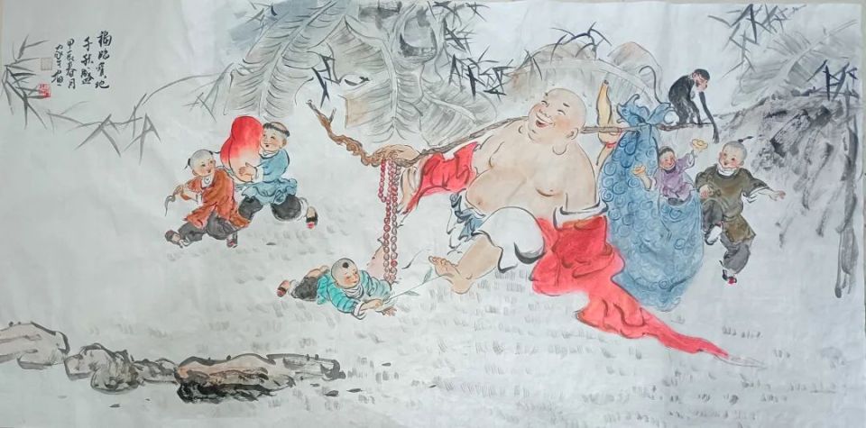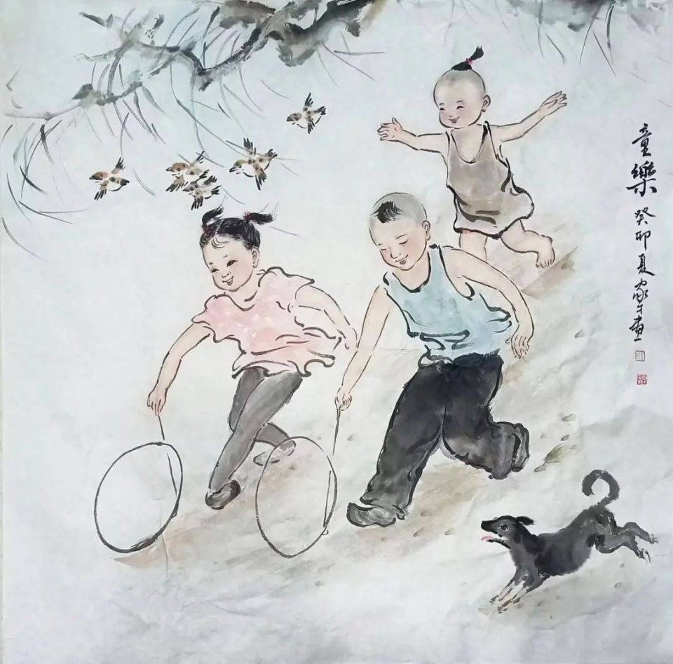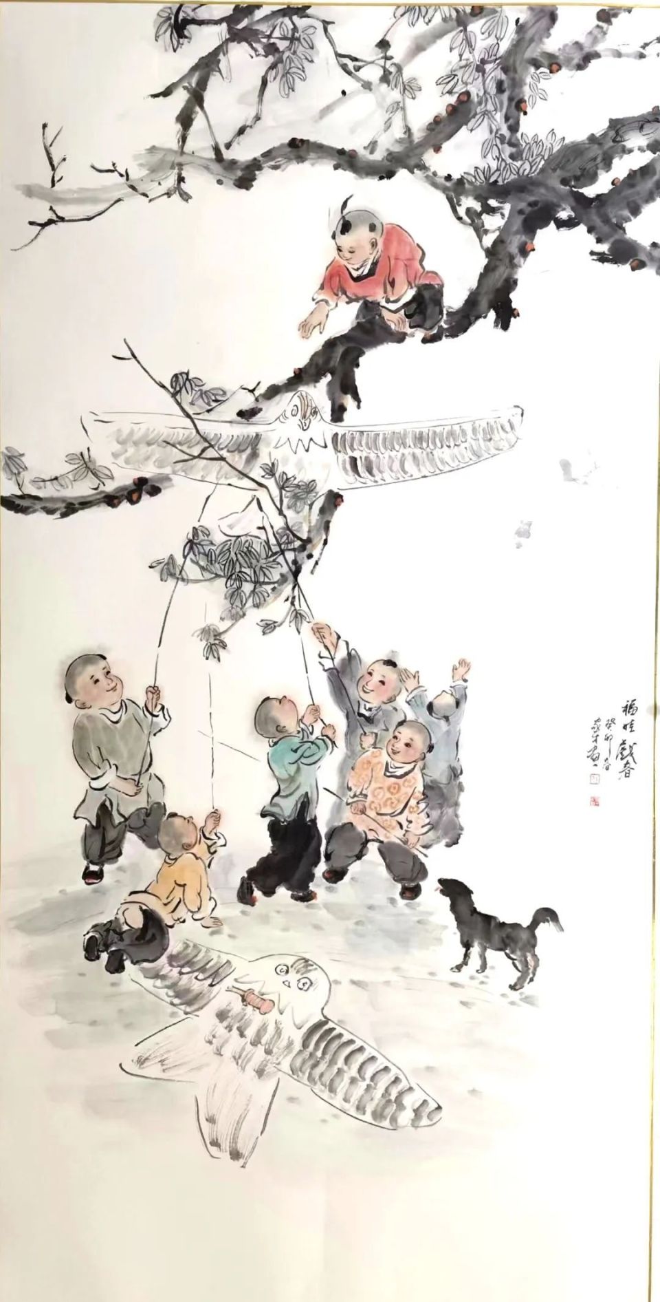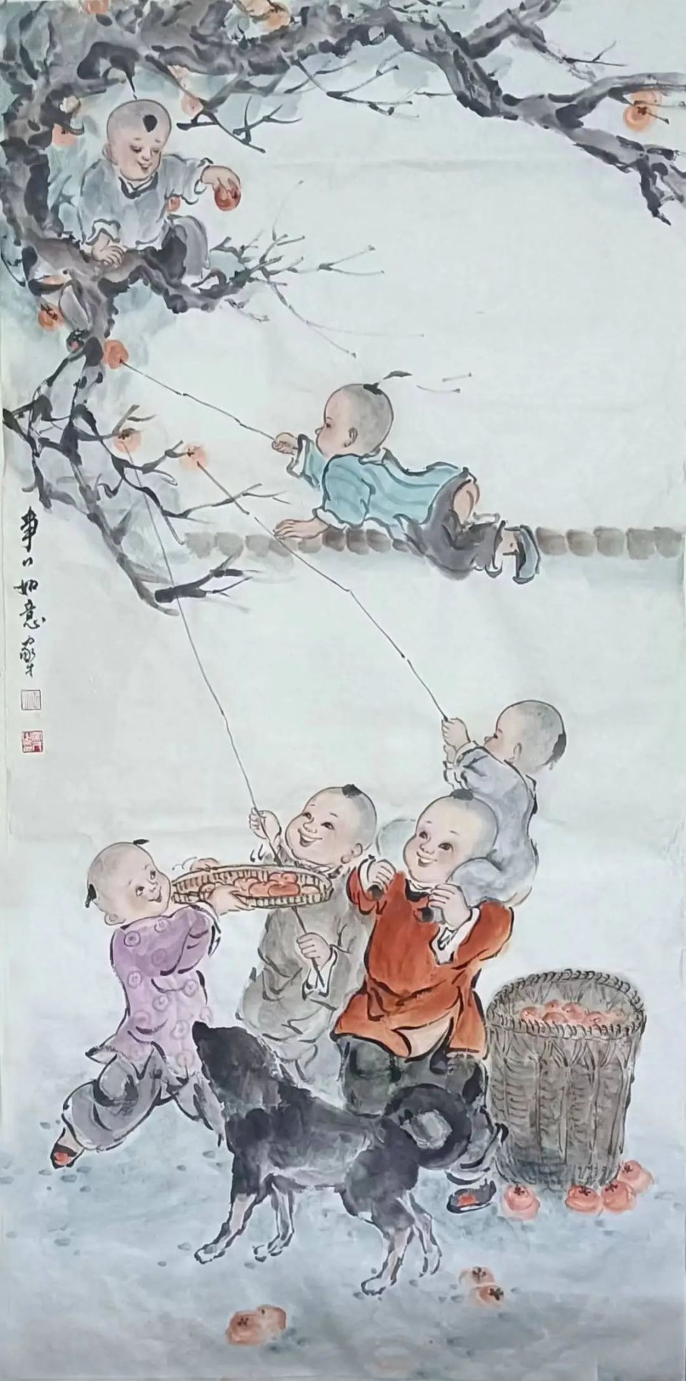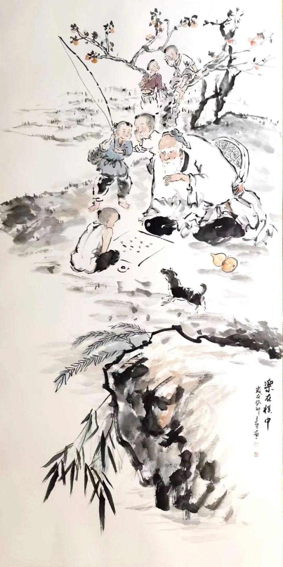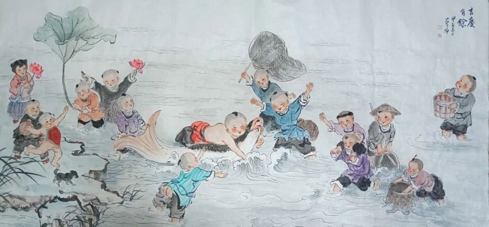 王家才女士的国画作品《有余图》更是她的代表作之一。这幅画作以童真与自然为主题,通过细腻的笔触和巧妙的构图,展现出了孩子们与大自然和谐共生的美好画面。画中的孩子们或蹲或站,或捕鱼或嬉戏,每一个细节都充满了生活的气息和人文的情怀。
