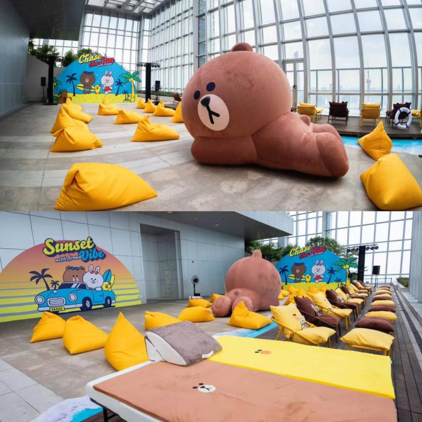 值得一提的是,LINE FRIENDS亦于上海北外滩来福士西塔57楼层空中花园打造限时开放的“布朗熊落日派对”。北外滩最高层在LINE FRIENDS的创意陈列下,化身为可观赏上海外滩和陆家嘴美景的“高空沙滩”,粉丝们可以在饱览魔都景观的开阔视野下躺在懒人沙发、沙滩椅上共赏落日,与布朗熊创意美陈拍照打卡。在8月4日、10日、11日三天,粉丝们通过官方预约即可获得在布朗熊主题休憩空间内欢度夏日的体验机会。与此同时,品牌也将于8月3日举办“最高的布朗熊生日会”特别粉丝场活动,邀请粉丝到场与布朗熊亲密互动,并参与DIY夏日主题刨冰活动,与BROWN一同享用亲手制作的沁爽甜蜜,在轻松惬意的盛夏氛围中抛开烦恼焦虑,共创独一无二的庆生回忆。