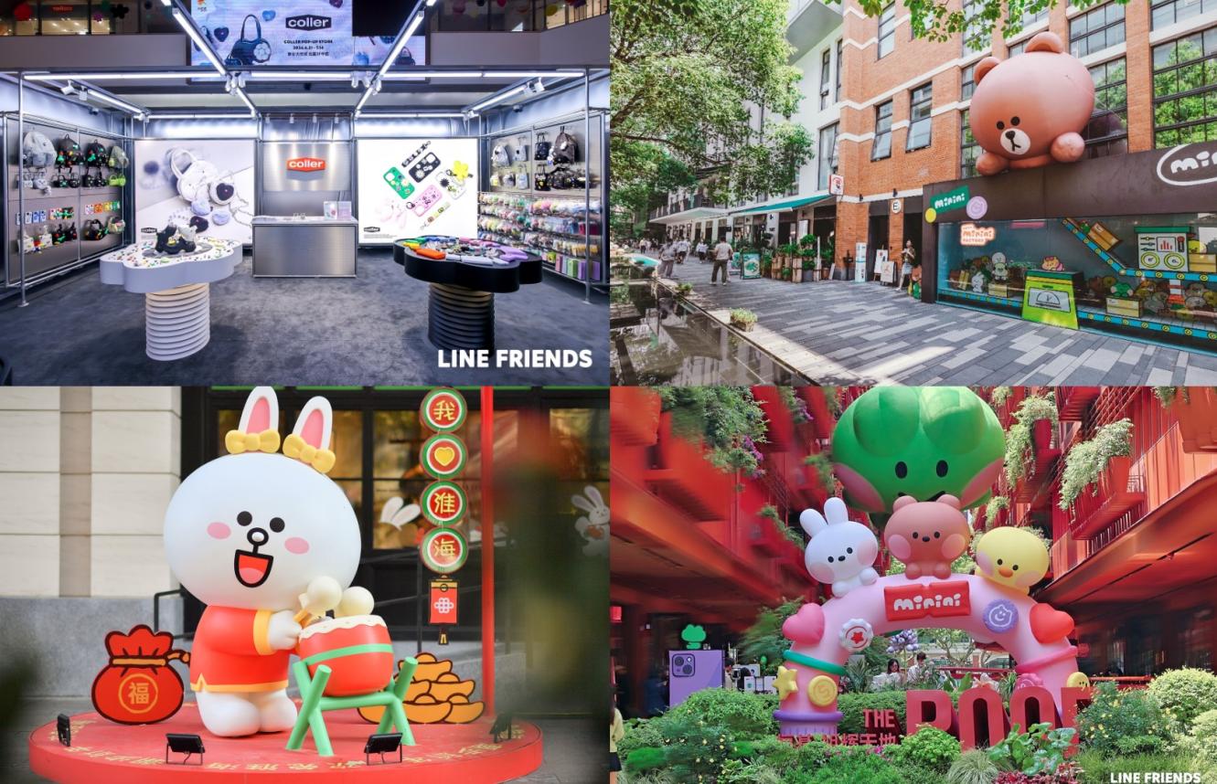LINE FRIENDS积极携手异界伙伴合作融创,合力探索IP业态的多元化新玩法、新模式、新变革。LINE FRIENDS官方旗舰店于2024年1月携全新多元IP重磅回归线下,正式入驻上海美罗城。此前,品牌曾于2023年推出以创意互动产品COLLER为主体的多家“LINE FRIENDS轻体验店“,秉持可持续发展的绿色理念探索“IP+新零售”商业模式。在“沉浸式线下体验业态”层面,品牌先后联合上海潮流街区M+幸福里、淮海集团、野邻花园营地、SankToys、YEENJOY STUDIO等跨界品牌发力街域场景营销、乐活体验营销,并每年与中国热门城市地标景点融创“SALLY DAY城市地标行”,渗透本土消费者生活的多元行迹触点。在“IP+创新商业模式”层面上,品牌联合微博、爱奇艺、奈娃家族、孩之宝、Bilibili等品牌与平台旗下人气IP,挖掘双IP联动焕新的可能性,更联动抖音、B612、支付宝等互联网平台共创娱乐型IP+线上互动型产品。在“虚实交互的数字化发展”层面上坚持推动数字化业务,先后携手流媒体娱乐服务商Netflix(原创动画系列)、全球移动游戏开发商SUPERCELL(Braw Stars)、头部游戏公司NEXON(KartRider)等公司开展IP合作业务,并通过携手腾讯幻核推出NFT数字藏品;与VeeR共创VR快闪空间与品牌中国首部VR作品《布朗熊的惊喜派对》;携手数字艺术家打造创意裸眼3D视频等方式,真正将虚实互动落实于商业与内容的联动。在“精品化创意内容资产”层面上,LINE FRIENDS更发挥内容创作优势,携手The Pinkfong Company、快看APP、奈娃家族等头部品牌在动画番剧、漫画、游戏、单曲及MV等多维内容形式上探索多维可能性。在“细分化圈层触点定制”层面上,LINE FRIENDS持续围绕母婴亲子、露营、宠物、环保、音乐、潮玩和艺术等主力兴趣聚点圈层拓展多维业态,打造有针对性、有共鸣性的营销。