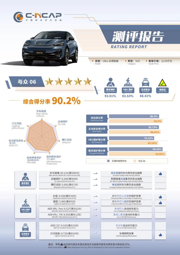 年轻人选车,颜值智能要拉满,但安全?往往藏在配置表最后几行。直到最近某新势力标杆i8的碰撞测试引发热议,大家才猛然想起:安全,才是一台车最硬的“底妆”。而刚刚拿下C-NCAP 五星评级、综合得分率92% 的与众06,正默默展示着德系基因的“基本功”。