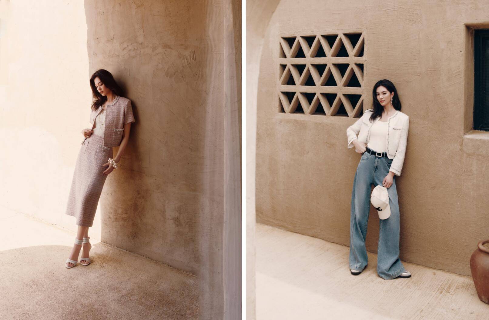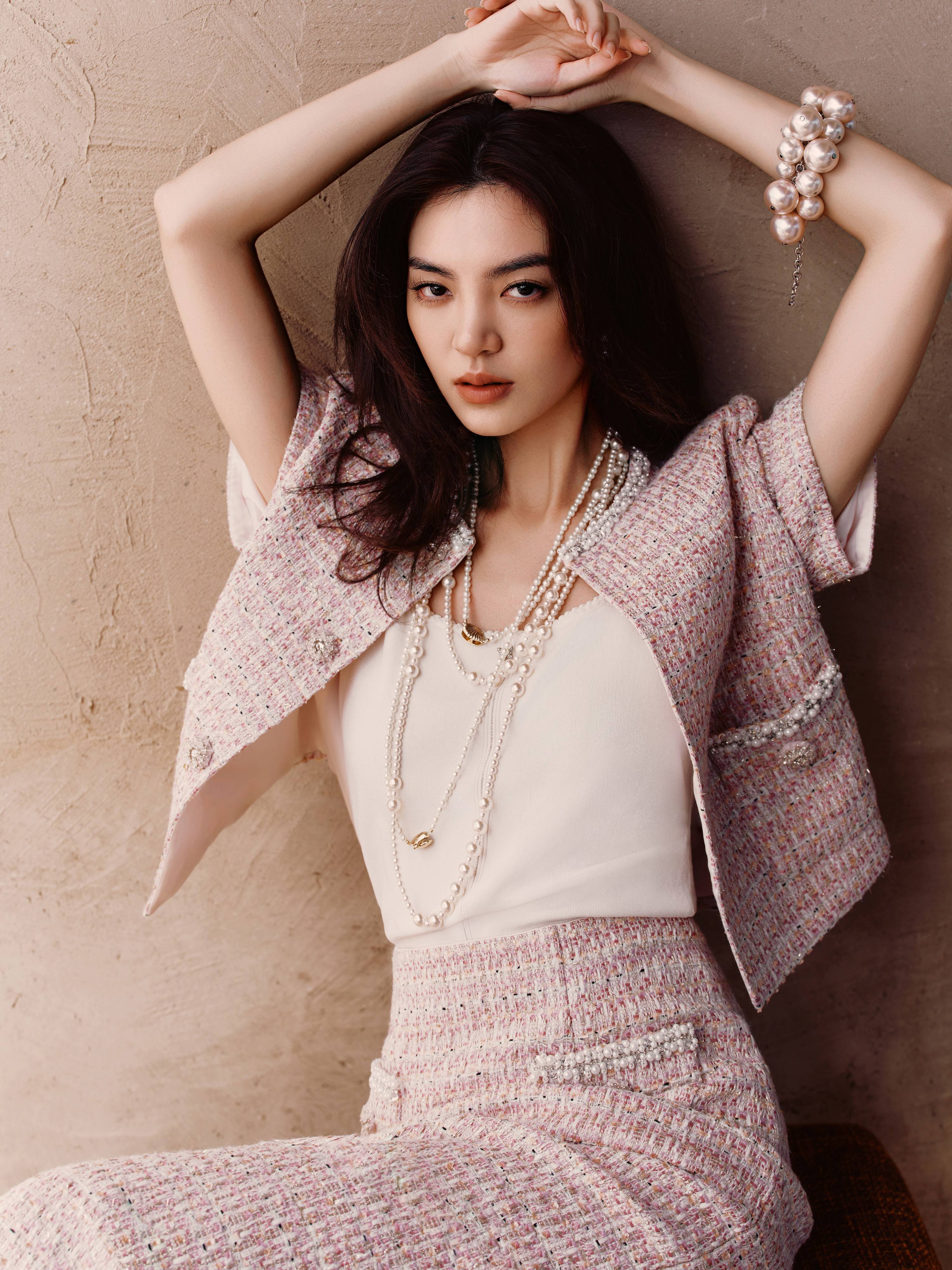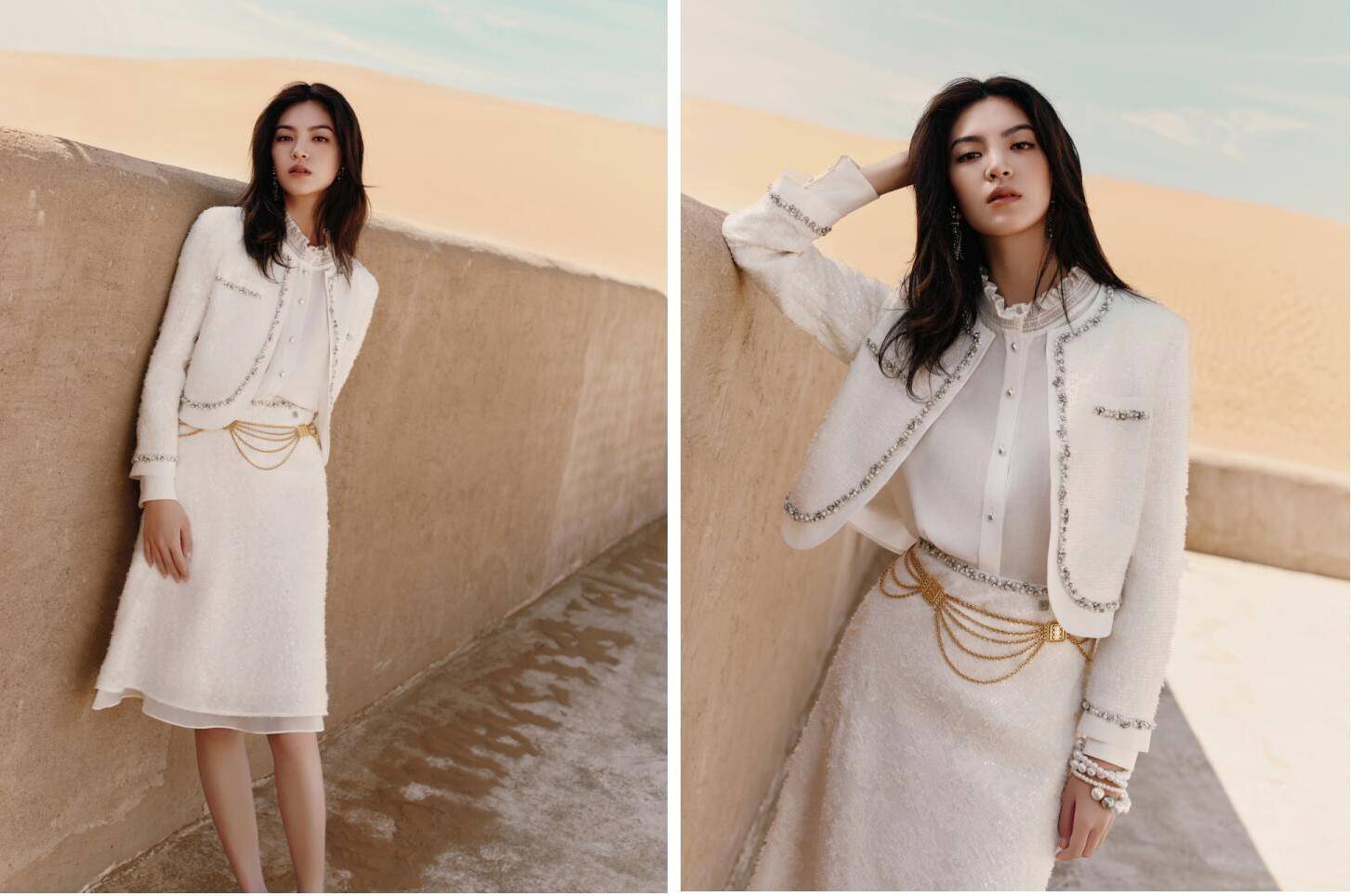 金丝线织花的细腻、立体毛织的丰盈, 短款香风外套与丹宁混搭,呈现松弛摩登与高级质感,精工刺绣融入珍珠饰链在细节处既低调又闪耀。金属腰链点缀修身长裙,曲线与飘逸裙摆之间释放流动感,传递女性多元面向,令整套造型在静谧与锋芒之间自成故事。