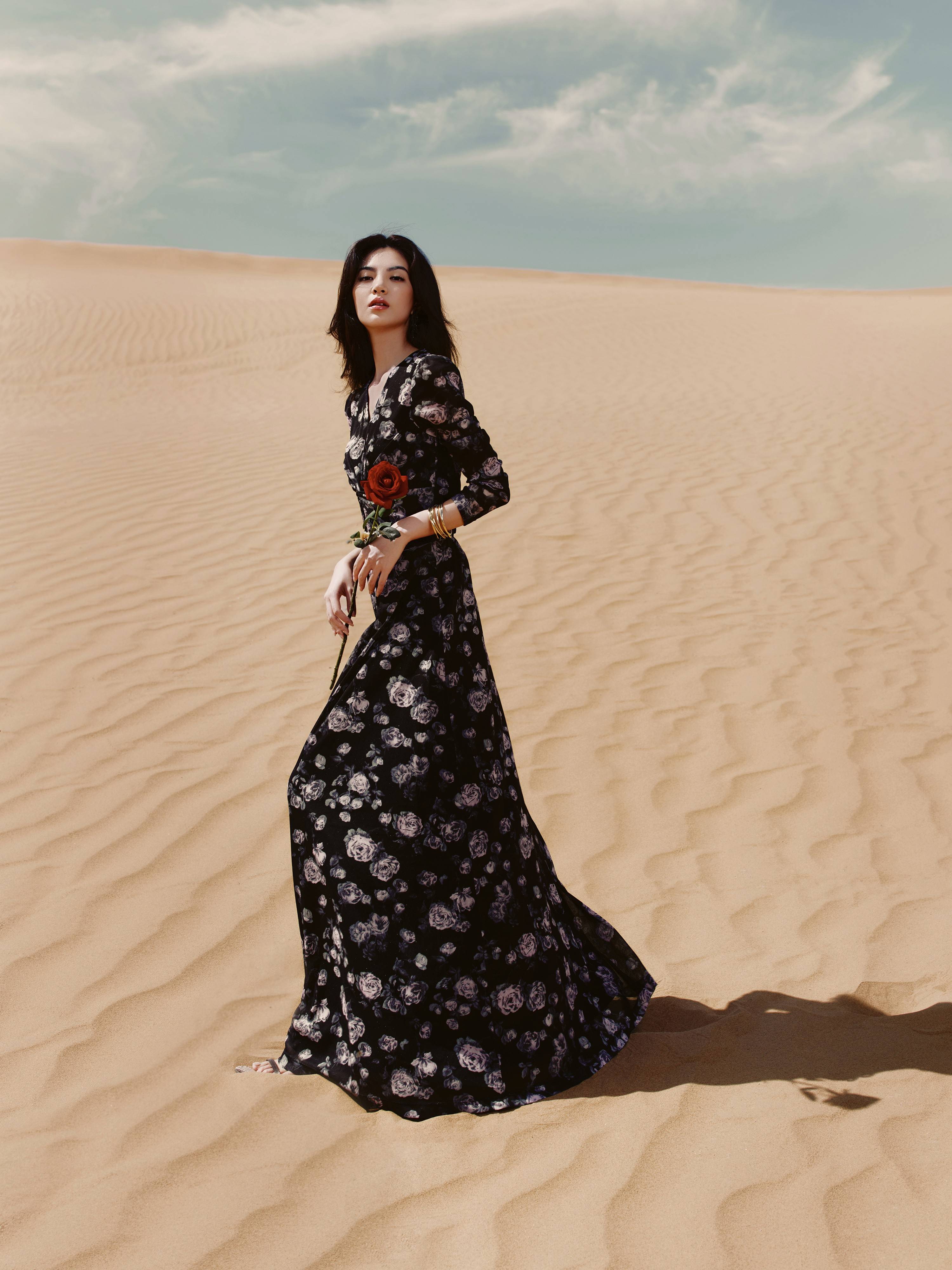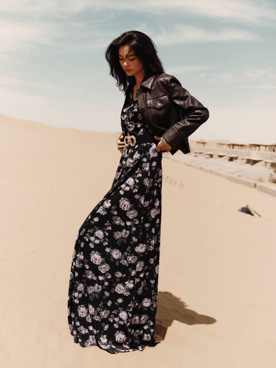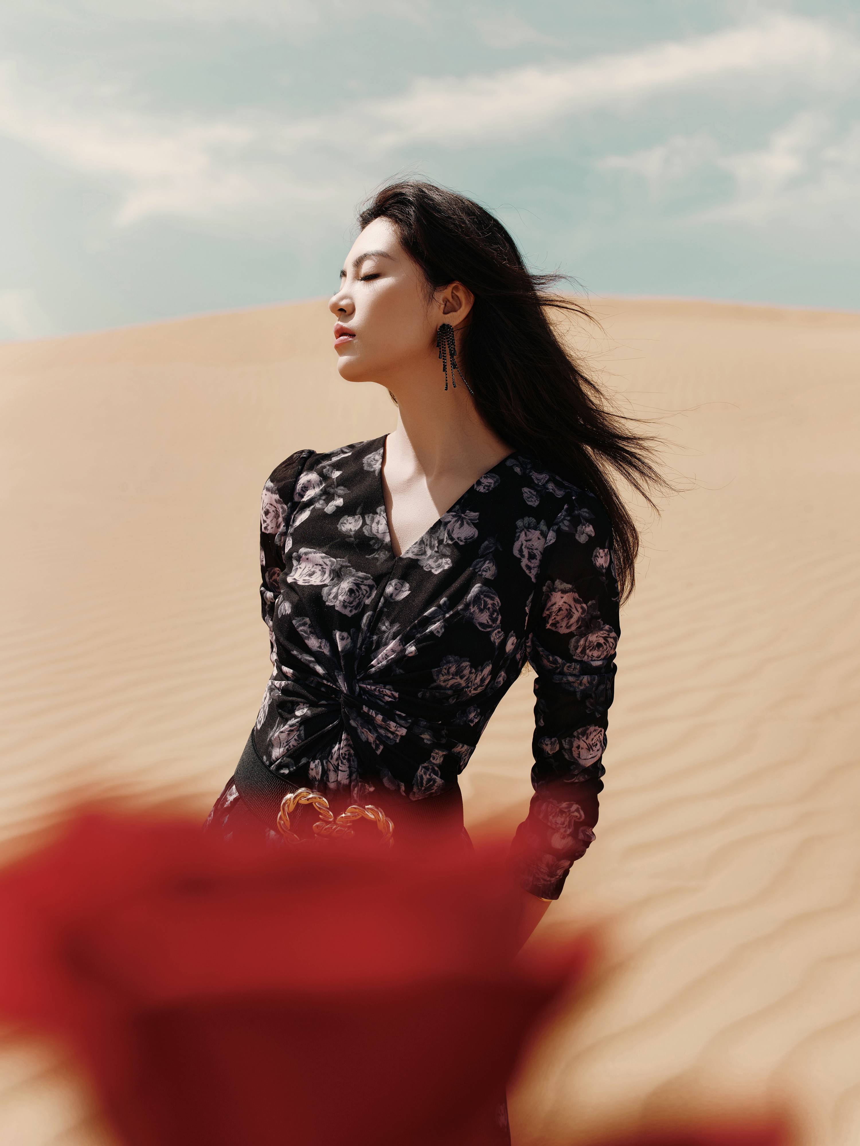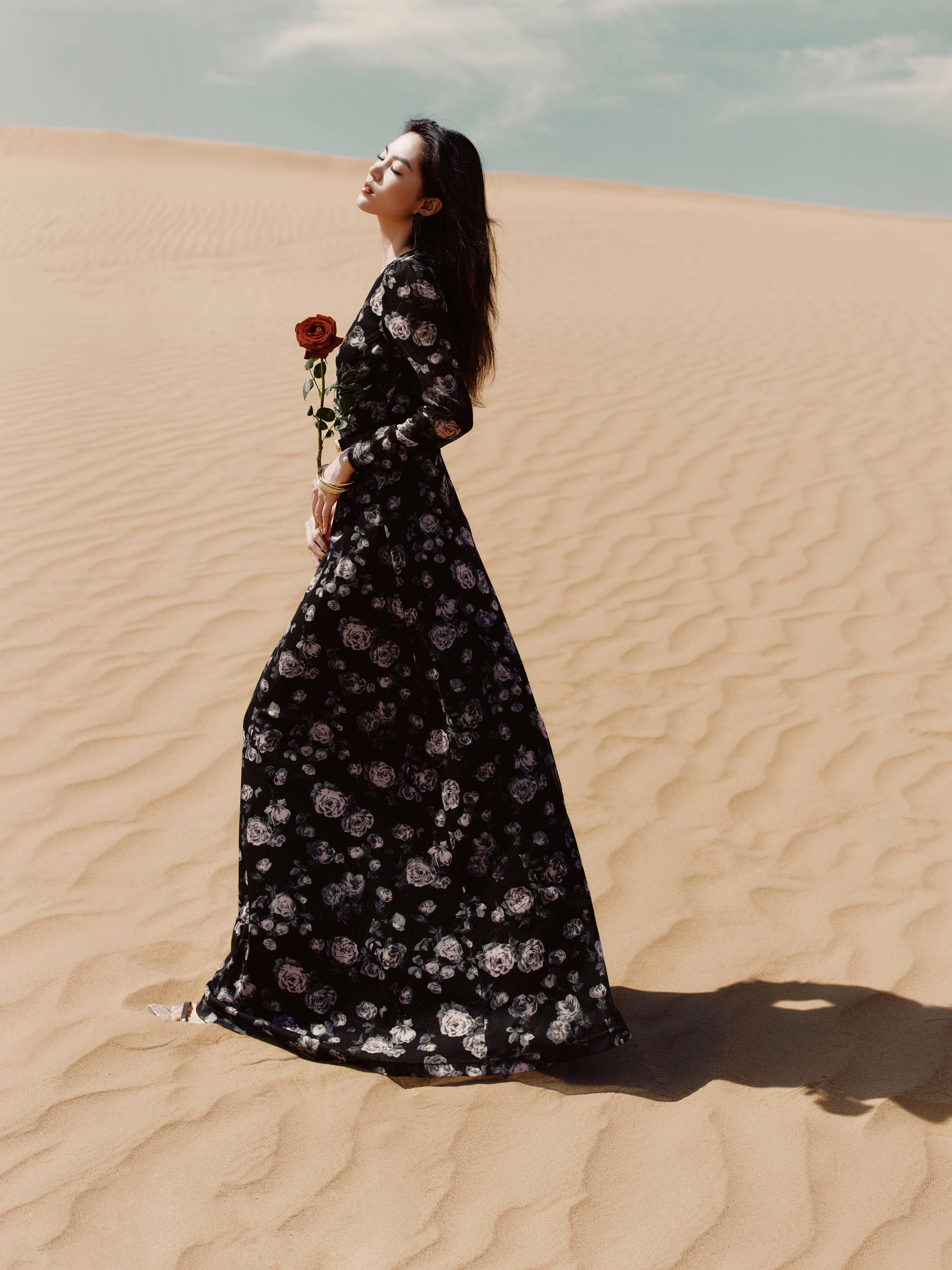 本系列以沙漠的色彩为底,以玫瑰的姿态为形,将自然与人文的美学融入面料与工艺中,全面演绎精致松弛的平衡;沙漠暖驼与玫瑰冷粉的温柔交错呈现,将经典玫瑰印花融入黑底长裙,花影在步履间轻盈流动,诉说女性的独立与浪漫。